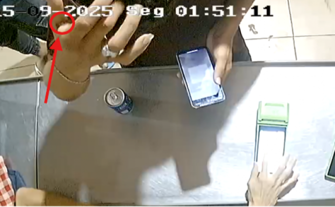 Em um dos registros, é possível observar claramente marcas de sangue na mão de um dos investigados no momento em que ele realiza o pagamento de uma compra no caixa do estabelecimento.